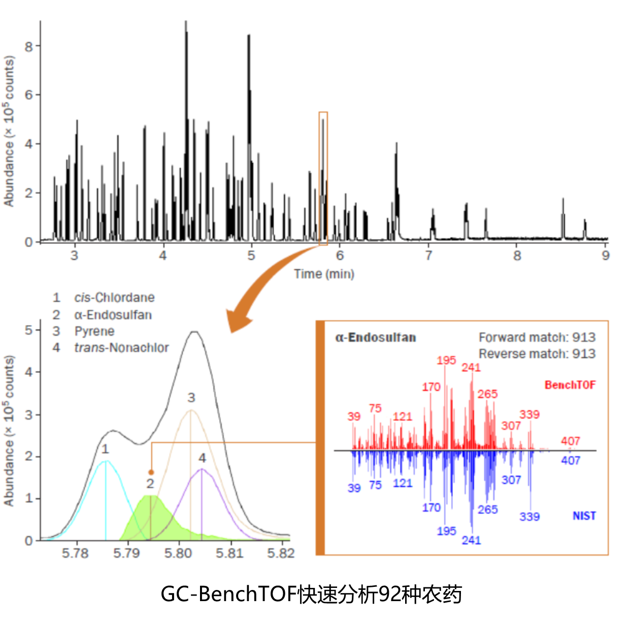 ►BenchTOF 飞行时间质谱分析中可得到化合物所有离子碎片,使其比质量过滤四级杆质谱更灵敏。同时采用直接提取离子源技术,就完全可以在全扫描模式下,做到对已知化合物和未知物同样高的检测灵敏度。可结合全二维气相对土壤中VOCs和SVOCs污染物和新型污染物进行筛查,BenchTOF飞行时间质谱得到的谱图可直接进行NIST 或Wiley谱库检索,并结合专利的串联离子源技术,同时得到70eV和低电压的电离两个质谱图,方便化合物快速准确定性。 BenchTOF飞行时间质谱具有很高采集速率,可连接快速气相在10分钟内对92种环境污染物完成分析,提高分析通量,非常适用于应急监测。