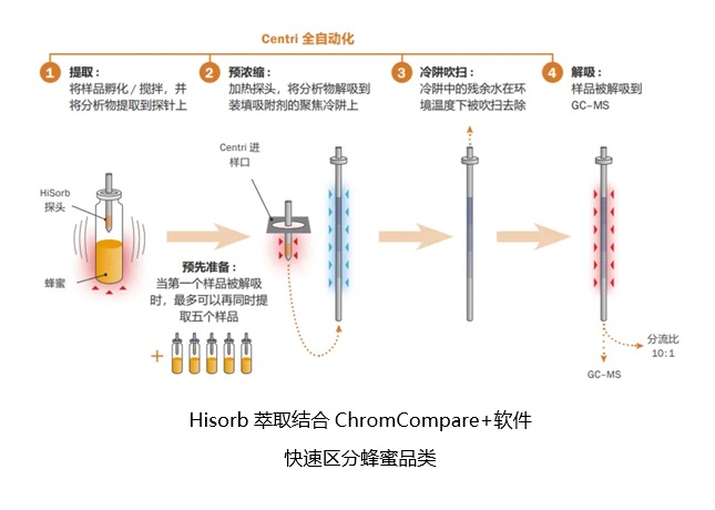 ► 通过使用 Hisorb(大体积吸附萃取棒)对蜂蜜进行萃取分析,结合 ChromCompare+数据处理软件,能快速区分不同品类的蜂蜜。Hisorb灵敏度高,比SPME最大可提高100倍,可分析更全面的风味成分,在研究品类差异及发现造假产品方面优势明显。ChromCompare+软件利用主成分分析,能区分不同来源的蜂蜜产品,还能找出非蜂蜜(或低含量蜂蜜)的金色糖浆。