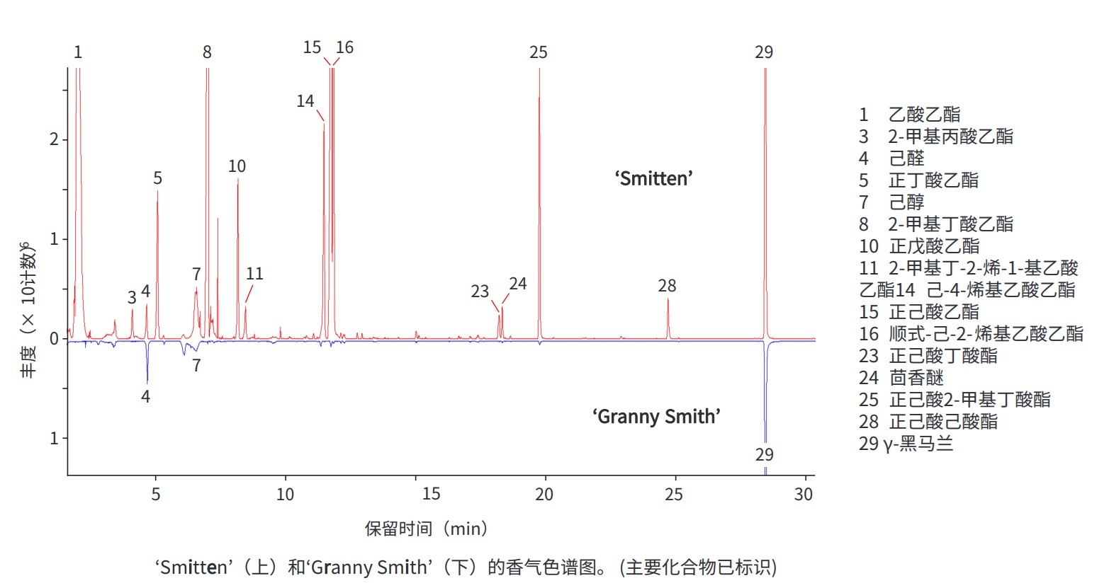 ►使用创 用Markes的微池/热萃取(μ-CTE)新的Centri多功能热脱附结合GC-MS分析获得的数据可用于食品香气特征的剖析。在该研究的例子中,将两个苹果品种的VOCs通过动态顶空吹扫入吸附管富集取样,然后在Centri上分析。该分析的结果与消费者的感官体验具有一致性,可突出感兴趣的关键挥发物。