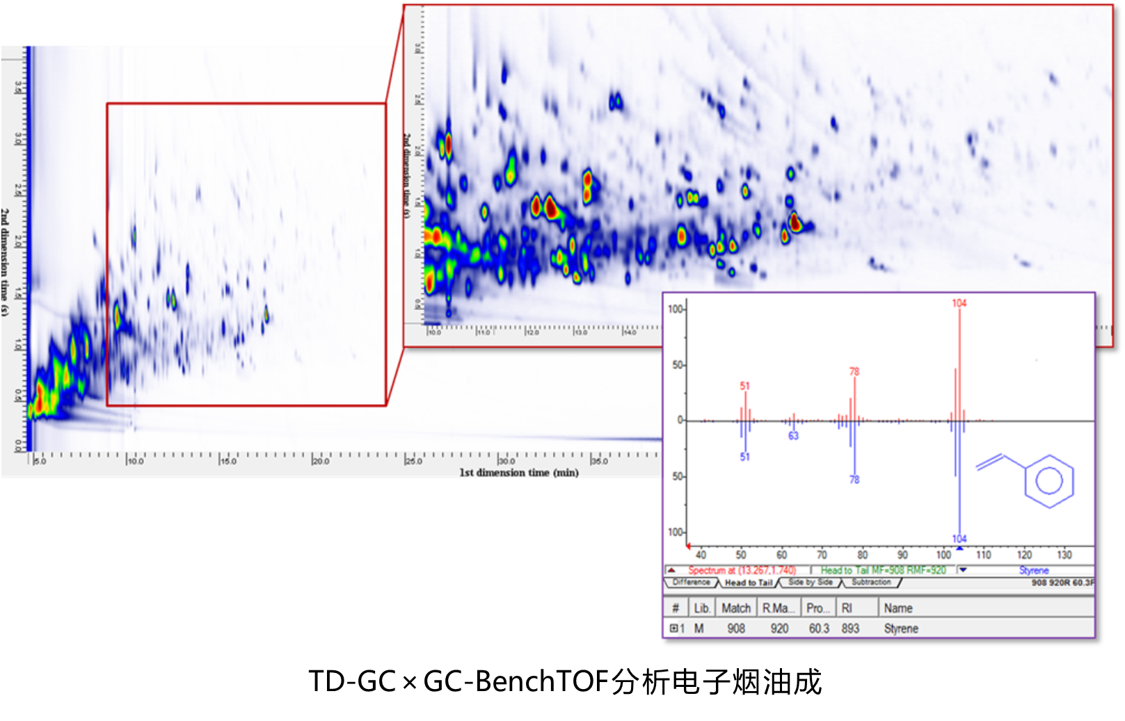 ►使用 Markes的Easy-VOC泵采集电子烟气或香烟的烟气到吸附管 ,也可将烟草直接至于空吸附管中进行加热脱附,再通过Centri热脱附模块进行富集聚焦进样,而后结合INSIGHT全二维气相增强分离,除了有助于检验是否符合法规外,这种方法对质量控制和产品改进也很有价值,例如可检测尼古丁和香味化学物质的浓度变化,或检验是否存在污染物。BenchTOF飞行时间质谱得到的谱图可直接进行NIST 或Wiley谱库检索,并结合专利的串联离子源技术,同时得到70eV和低电压的电离两个质谱图,方便化合物快速准确定性。