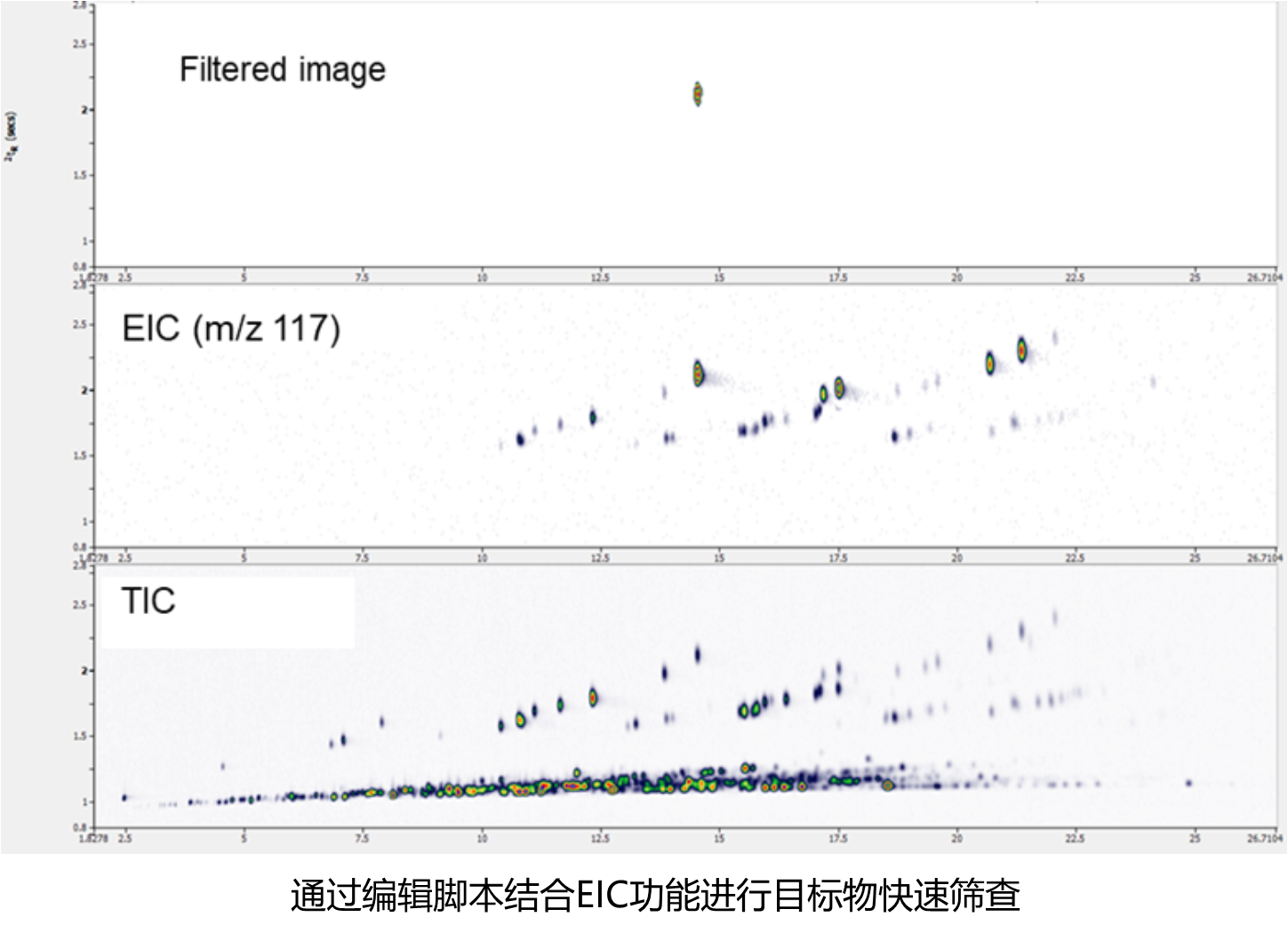 ►结 合强大的全二维软件ChromSpace,不仅可以实现分析全流程控制,同时采用EIC和编辑脚本命令对于筛选复杂数据,识别目标化合物和族类化合物非常有用,提高工作效率。