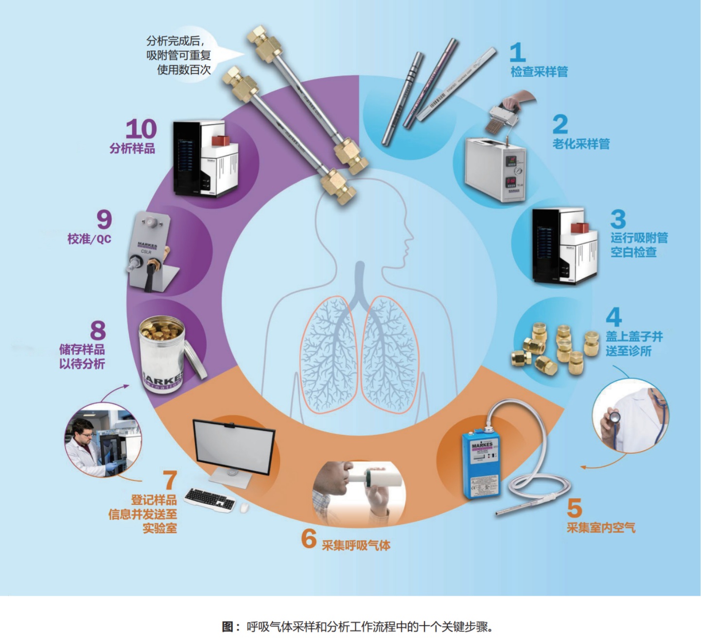 ►呼吸为 人体健康提供了一个窗口,分析其中含有的挥发性有机化合物(VOCs)可以提供关于疾病诊断、代谢应激监测以及暴露于有毒化学物质的信息。有多种技术可用于研究这些挥发性有机化合物(VOCs),但其中最简单的一种是直接将呼出的VOCs捕集到装有吸附剂的管中,然后通过热解吸-气相色谱-质谱(TD-GC-MS)进行分析。