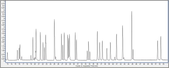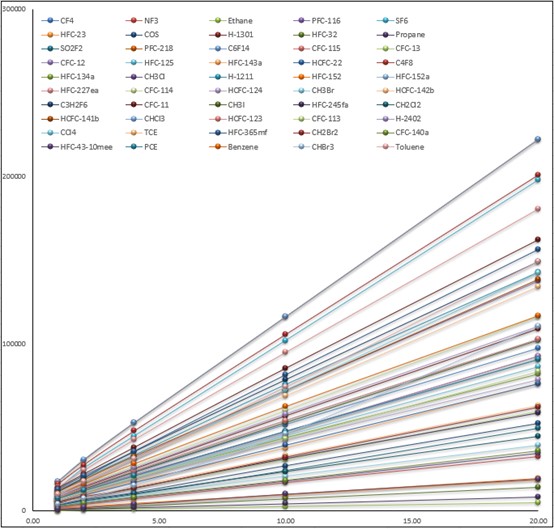 49种ODS和含氟温室气体等挥发性有机物标准气体,NuVo 200预浓缩进样GCMS分析总离子流图。